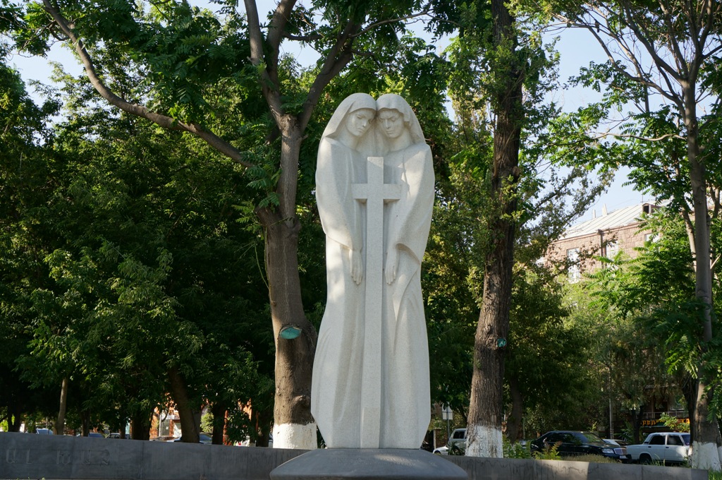 Монумент высотой в четыре с половиной метра высечен из гранита пепельно-белого цвета. Он изображает две женские фигуры, вместе склонившиеся над крестом, будто бы оберегая его. Над скульптурой работали архитекторы Размик и Тигран Манукяны, коллектив скульпторов и других специалистов под руководством Фрида Согояна. Возведен памятник на средства армянских предпринимателей, живущих в Москве – Сергея Амбарцумяна и Макара Наапетяна.