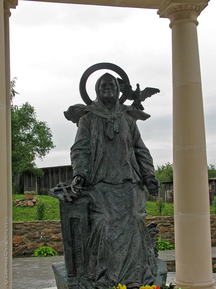 На родине святой Матроны, в селе Себино Тульской области, где живет всего 17 человек (не считая дачников) – не один, а целых два памятника блаженной. Первый – «Матронушка встречающая» – установлен на въезде в село. Но более известен другой, помещенный в ротонду и включенный в мемориальный комплекс, посвященный чтимой святой. Святая Матрона стоит, подняв незрячее лицо к небу, будто вслушиваясь в слышный ей одной Голос. Ветер развивает ее простые одежды и платок, которым покрыта голова святой. На плече угодницы Божьей, расправив крылья, сидит голубь. У очень трогательного скульптурного изображения летом и зимой можно видеть живые цветы, которые привозят паломники – особенно часто это белые хризантемы и розы, которые при жизни так любила Матронушка.