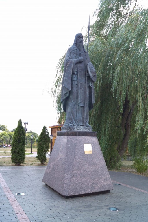 К слову, в Брянске этот памятник святому – не единственный. Есть и другой, в составе скульптурной группы на Покровской горе, созданной в 1985 году к тысячелетию города. Пересвет восседает верхом в богатырском доспехе, держа копье в руке. У ног его коня присел с гуслями в руках легендарный сказитель Боян.