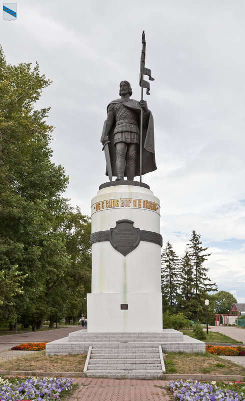 Созданная им скульптура героя битвы на Чудском озере установлена на высоком белом постаменте. Святой Александр Невский изображен с непокрытой головой, в воинском доспехе и плаще. В правой руке он держит меч, в левой – хоругвь. Глава князя слегка повернута, он будто обозревает войско перед решающей битвой. На постаменте высечена надпись с самыми известными словами героя: «Не в силе Бог, а в правде».