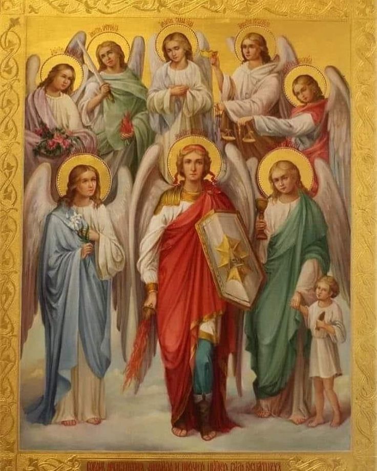 Согласно христианскому вероучению, чины ангельские подразделяются на три триады. Высшую из них – ближайшую к Богу – составляют серафимы, херувимы и престолы (именно к чину серафимов, «пламенеющих», относятся архистратиг Михаил и провозвестник божественной воли Гавриил, хотя оба они нередко имеются арх-ангелами – то есть, буквально, «старшими ангелами»). Вторую триаду составляют господства, силы и власти. И, наконец, третью – начала, архангелы и ангелы; каждый человек со дня крещения имеет собственного ангела-хранителя.
