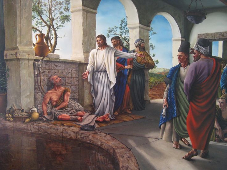 В субботу Божественный Учитель с апостолами пришел в Иерусалим, к источнику, называемому Вифезда или Овчая купель (в одном из двух сообщающихся водоемов мыли скот, продававшийся затем на рынке как жертвенный). Временами ангел Господень незримо сходил в источник, вызывая в нем возмущение воды – и тот, кто первым спускался в него в такое время, исцелялся, чем бы он ни болел. Среди множества людей, бывших у источника, находился и обездвиженный человек, который долгие годы мечтал, чтобы его опустили в водоем, когда явится ангел, но никогда не успевал первым погрузиться в воду. Увидев его, Христос Господь спросил, хочет ли он выздороветь. «Так, Господи; но не имею человека, который опустил бы меня в купальню, когда возмутится вода; когда же я прихожу, другой уже сходит прежде меня» (Ин. 5, 7), – отвечал больной. Тогда Сын Божий велел ему: «Встань, возьми постель твою и ходи» (Ин. 5, 8). И стало по слову Его: больной встал, взял своё ложе и пошел. Иудеи, видевшие это вместо того, чтобы прославить Бога за совершенное им чудо, стали пенять выздоровевшему: «Сегодня суббота; не должно тебе брать постели» (Ин. 5, 10) и выспрашивать у него, кто его исцелил. Однако тот от радости забыл спросить имя своего благодетеля. Позднее Господь, встретив исцеленного Им в Храме, предостерег его: «Вот, ты выздоровел; не греши больше, чтобы не случилось с тобою чего хуже» (Ин. 5, 14). А он пошел и объявил ранее расспрашивавшим его, что его исцелил Иисус.