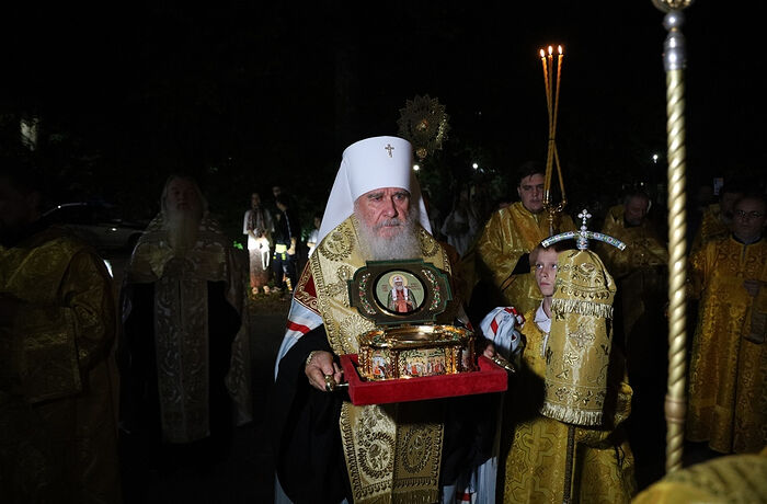 Вечером 8 августа митрополит Климент совершил вечерню с акафистом святителю Тихону. После богослужения митрополит Климент обратился к верующим со словами назидания и выразил благодарность за принесение святыни Святейшему Патриарху Кириллу, по благословению которого оно совершается. Затем состоялись торжественные проводы ковчега.