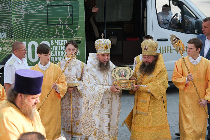 После встречи святыни Божественную литургию в соборе возглавили митрополит Астраханский и Камызякский Никон и епископ Ахтубинский и Енотаевский Матфей.