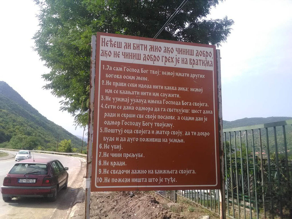 Большой стенд, на котором были написаны Десять Божиих заповедей на кириллице, простоявший 20 лет у въезда в северную часть Косовской Митровицы на севере Косово, исчез на прошлой неделе.