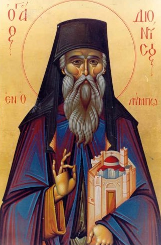 Стремление к миру, а также желание избежать епископства привели его на гору Олимп в префектуре Пиерия, где он сначала практиковал аскетизм, а затем основал монастырь, который сохранился до наших дней и который был разбомблен немцами во время Вторая мировая война Война. Получив от Бога дар исцеления, святой Дионисий с верой и смирением исцелял укрывавшихся в монастыре. Даже после его кончины благодатная моща его стала источником чудес для тех, кто с верой и благоговением ищет его благодати.
