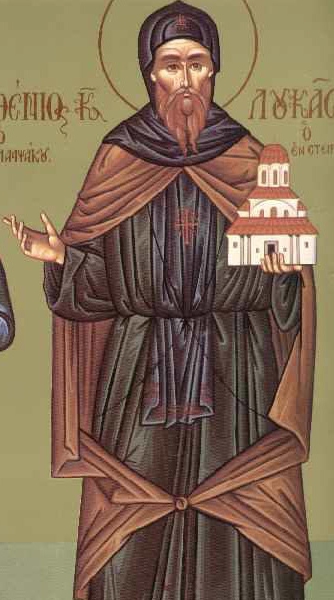 Святой Лука родился в 896 году нашей эры. в Фокиде. После окончания школы он занялся животноводством и одновременно умственно и напряженно тренировал свое тело и душу. Когда его родители умерли, он раздал все свое имущество бедным и после многих странствий поселился на постоянной основе на горе Стирион. Там вместе с другими монахами он построил монастырь, в который, благодаря его духовности и большой репутации, стекалось множество людей. Он почил в 953 году нашей эры, а его святая реликвия сохранилась в первозданном виде.