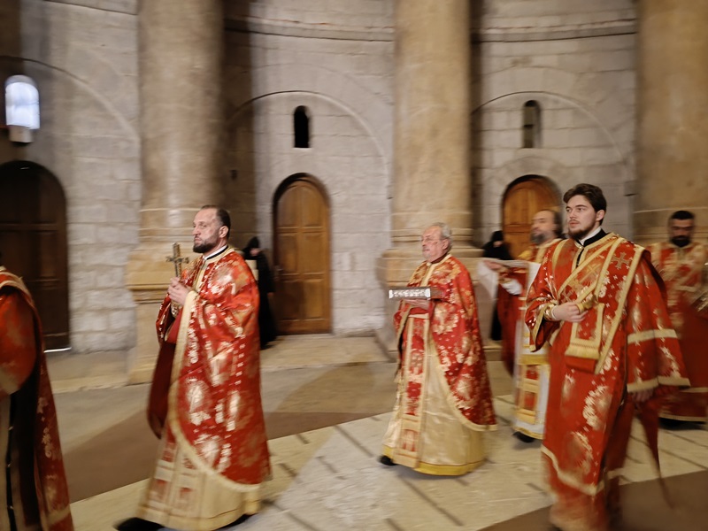 Этот праздник торжественно отмечался как «паррисия», блеском и благолепием, первоначально в Кафоликоне Храма Воскресения Утреней и Катавасиями и затем Божественной литургией Василия Великого в Пресвятом Гробе во главе с Его Божественным Блаженством Отцом нашим и Патриархом Иерусалимским Феофилом. Ему сослужили Их Высокопреосвященства Митрополит Капитольядский Исихий, Архиепископы Герасский Феофан, Константинский Аристарх и Лиддский Димитрий, иеромонахи Святогробцы, первым из которых был Старший Камарасис архимандрит Нектарий, диаконы и представители Московского Патриархата о. Вассиан и Румынского Патриархата о. Иоанн. Пели иеродиакон Симеон справа и монах Иосиф слева, в присутствии Генерального консула Греции в Иерусалиме г-на Димитрия Ангелосопулоса.