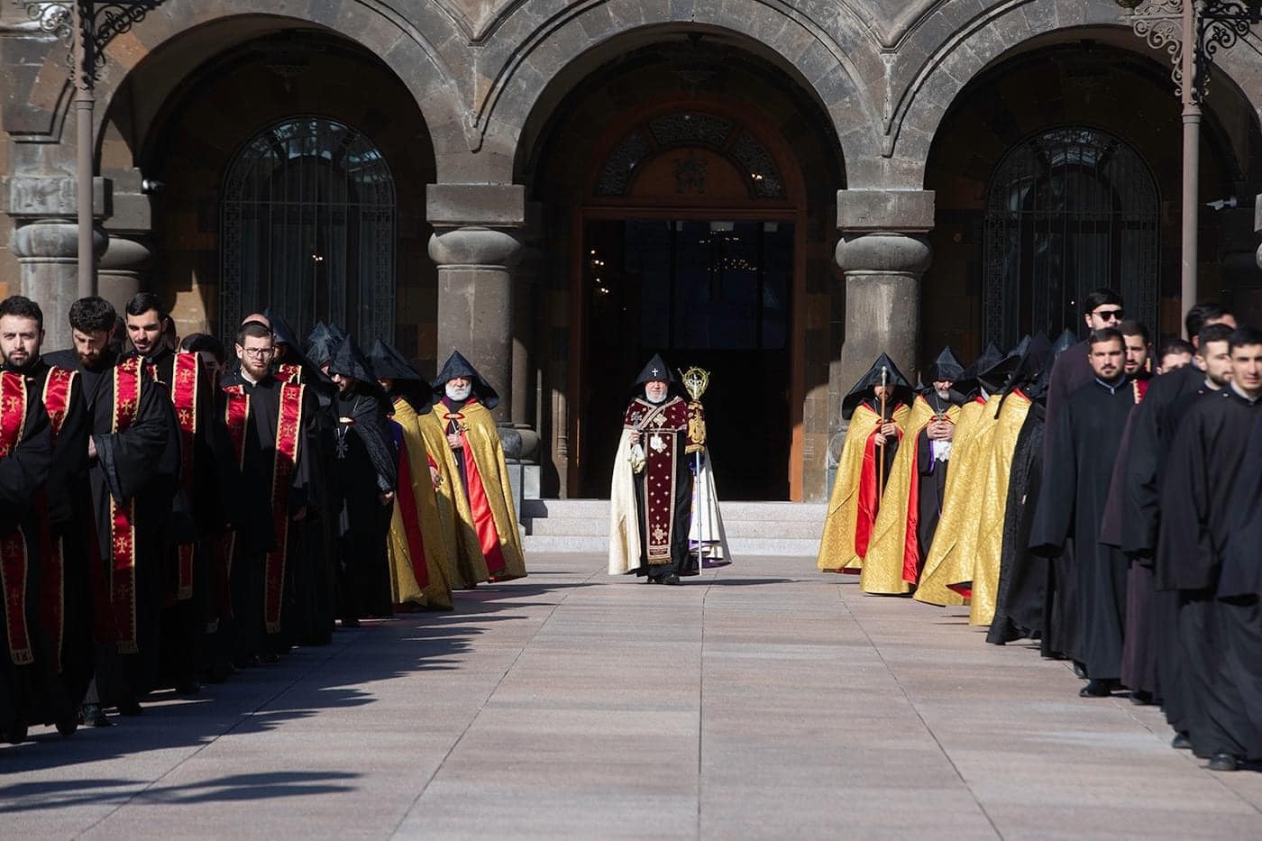 После окончания Святой литургии около 600 арцахцев, прибывших в Первопрестольный паломничеством из разных армянских епархий, собрались перед колокольней Первопрестольного собора.