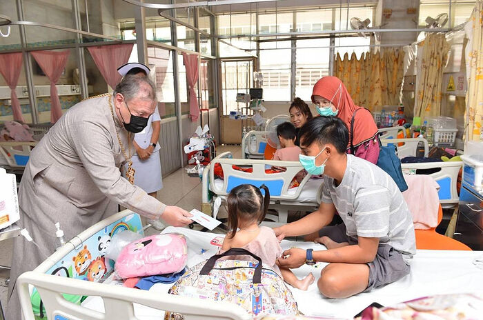 Отец Олег пообщался с детьми, проходящими лечение в госпитале. Родителям 50 маленьких пациентов были вручены конверты с материальной помощью от православных приходов. Общая сумма пожертвований составилa 100 тысяч бат, информирует сайт Таиландской епархии.