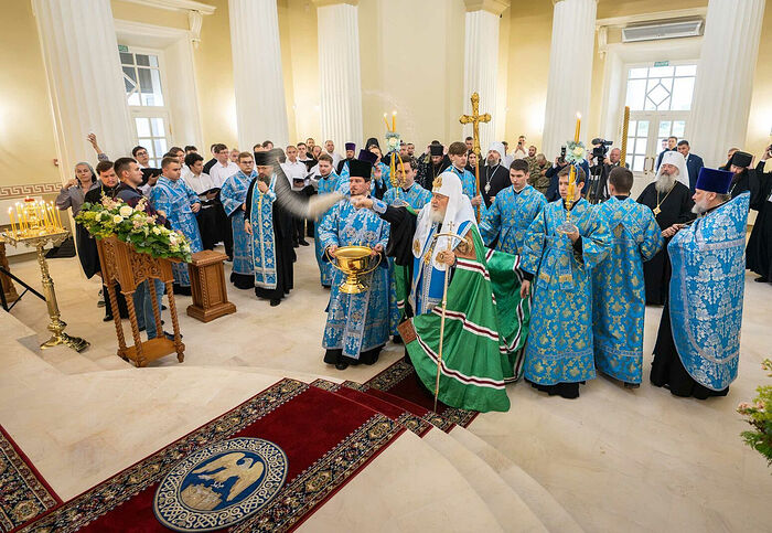В дар вновь освященному храму Предстоятель Русской Церкви передал икону святого праведного воина Феодора Ушакова: