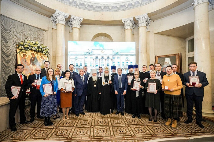 Затем Святейший Патриарх Кирилл вручил награды — диплом и медаль митрополита Макария — лауреатам Макариевских премий в области гуманитарных наук за 2025 год.