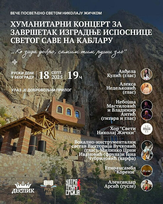 Организаторы концерта из общества «Деспик - Хранители корней» приглашают вас посетить вечер сербской духовной музыки, посвящённый Святому Николаю Жичскому, цель которого - сбор средств на завершение строительства Кельи Святого Саввы на Кабларе.