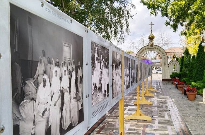 Выставка «Царская семья: любовь и милосердие» уютно расположилась на центральной аллее храма святителя Николая Чудотворца ст. Выселки Краснодарского края, перед входом в церковь.