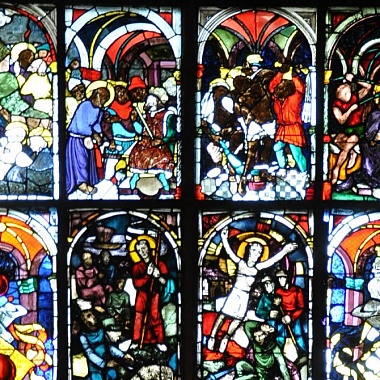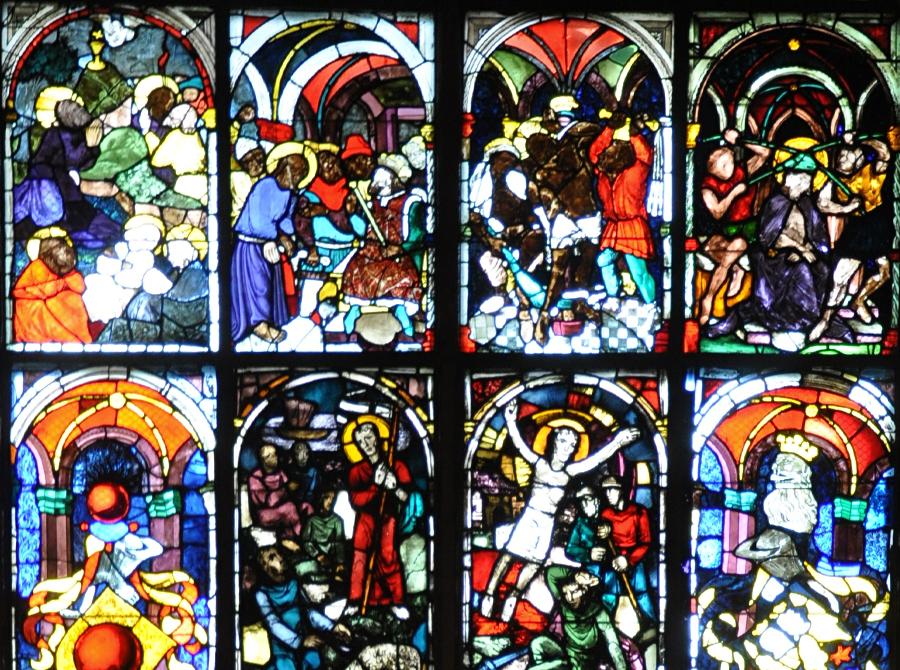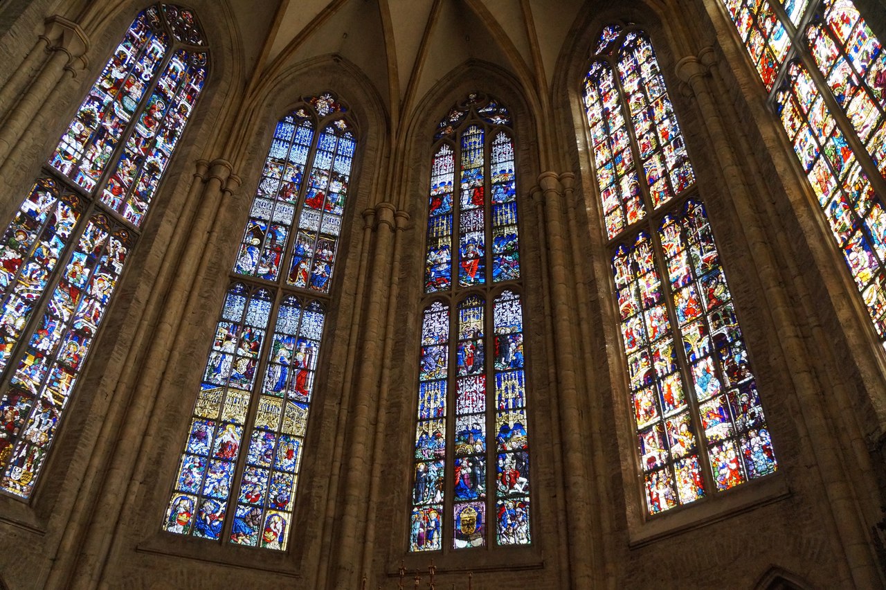 Внутреннее пространство собора украшают готические витражи. Шесть из девяти оригинальных витражей сохранились со времён средневековья. Старейший из них, сделанный в 1385 году на средства гильдии ткачей, изображает Деву Марию с Её матерью, праведной Анной — а также включает в себя сцены Рождества и детских лет Того, кто принёс спасение миру.