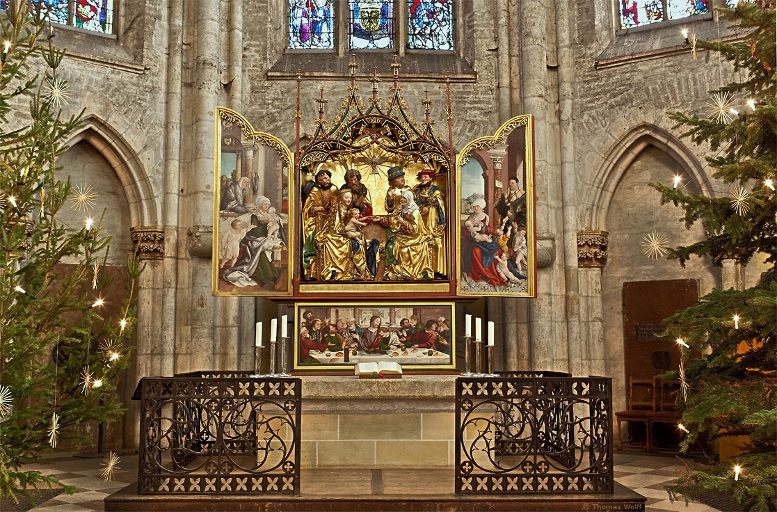 Центральный алтарь собора был создан в 1521 году Мартином Шаффнером. Внутри него можно увидеть сцены, изображающие Пречистую Деву с Её матерью, праведной Аннной, и Младенцем-Христом — а также Тайную Вечерю. Этот алтарь иначе называют алтарём Хутца — по имени главного жертвователя, представителя известной в Ульме фамилии, взявшего на себя расходы по созданию этого произведения искусства.