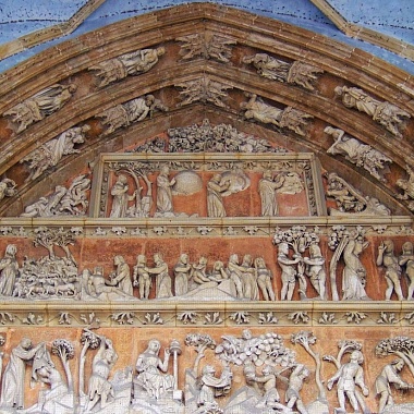 Западный портал собора имеет тимпан с изображениями на тему Сотворения мира. В углах тимпана прослеживается и тема Страшного суда, характерная для украшений, обычно размещаемых в этом месте. Интересно, что на одном из барельефов Господь держит в руках землю в виде шара. Иисус Христос в терновом венце изображён на средней колонне портала. Это копия работы скульптора Ганса Мульчера — её оригинал (1429) можно увидеть внутри собора, у юго-западной опоры хоров. Колонны у входа в собор украшены фигурами Пресвятой Девы Марии с Богомладенцем на руках, Иоанна Предтечи с агнцем, святого Антония с колоколом и святого Мартина с мечом.