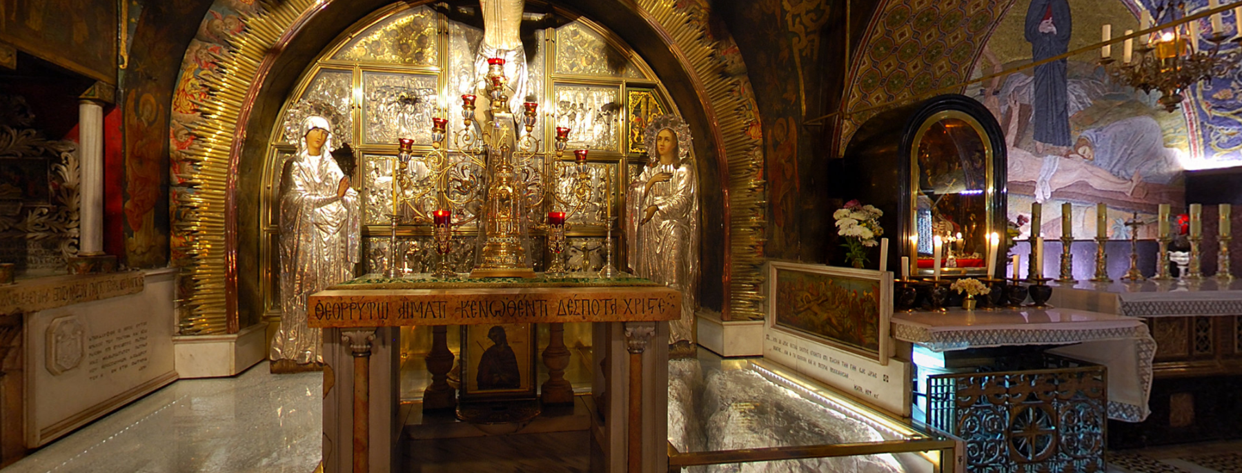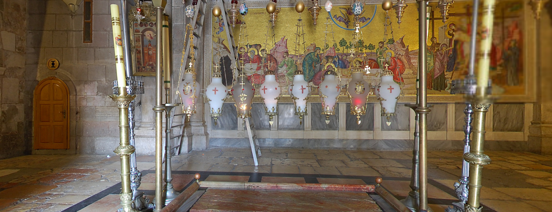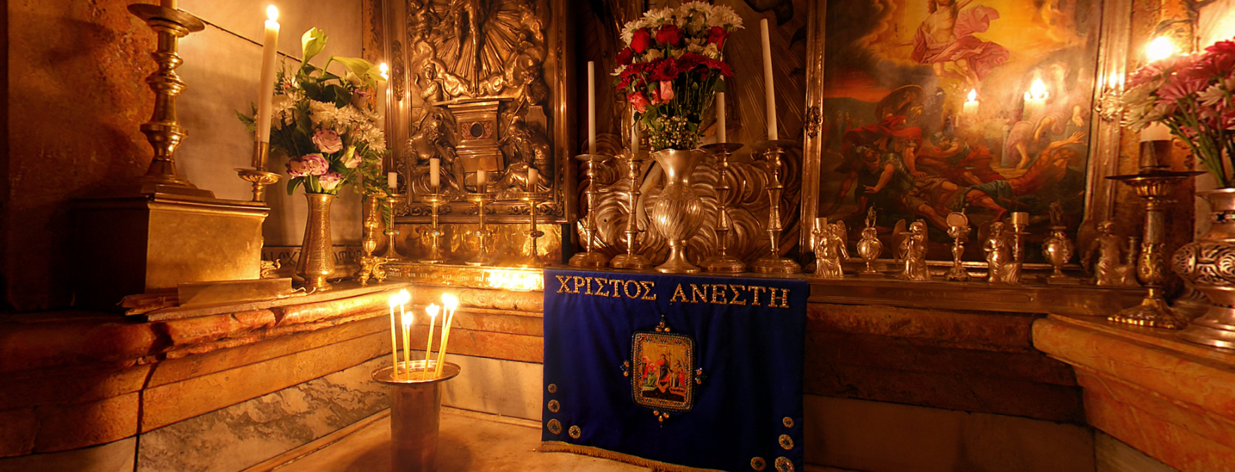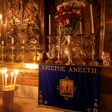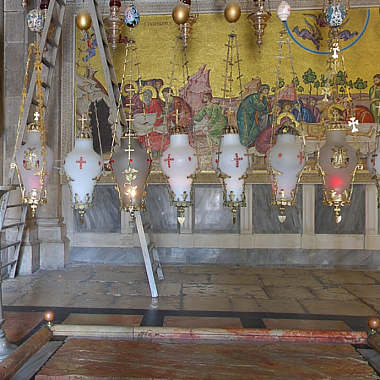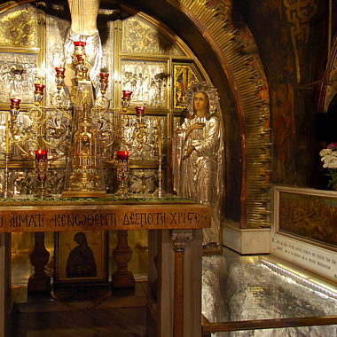 Мы находимся у Гроба Господня. Здесь завершился его крестный путь и его земная жизнь. Вот как описано это евангелистом Матфеем: И, взяв тело, Иосиф обвил его чистою плащаницею и положил его в новом своем гробе, который высек он в скале; и, привалив большой камень к двери гроба, удалился. Первосвященники поставили стражу и опечатали вход в Гроб.На рассвете первого дня недели Мария Магдалина вместе с другими женщинами пришли к Гробу, но нашли его пустым. Ангел Господень сидел на камне, ранее закрывавшим вход в гробницу. Он обратился к пришедшим: не бойтесь, ибо знаю, что вы ищете Иисуса распятого; Его нет здесь — Он воскрес, как сказал.