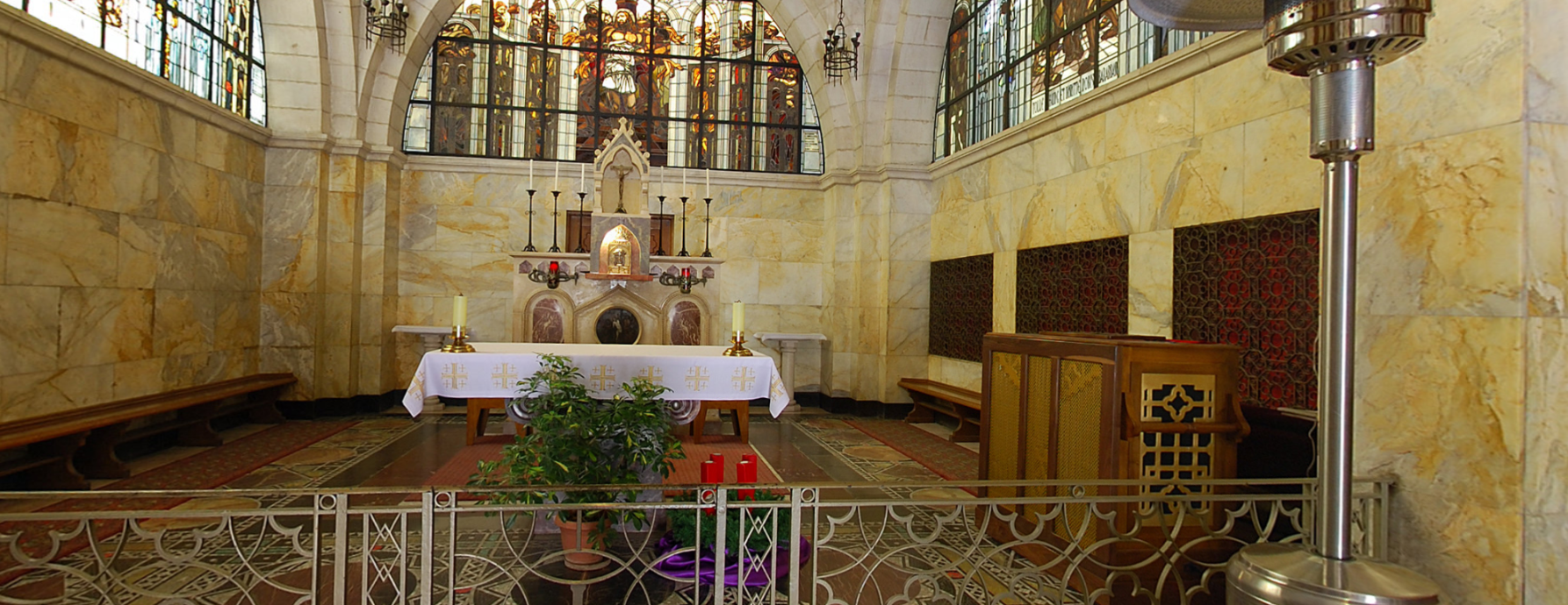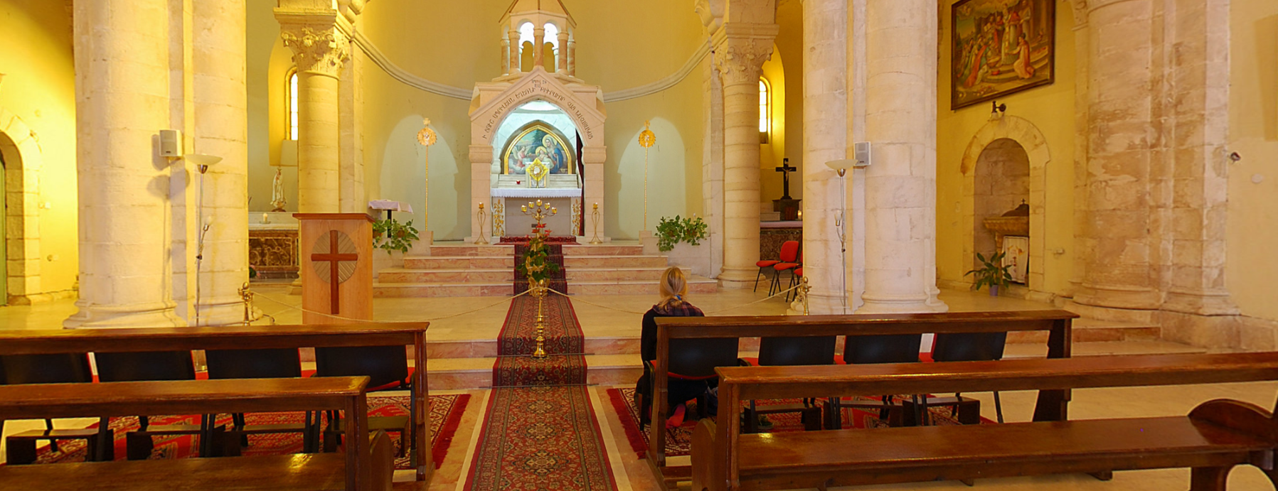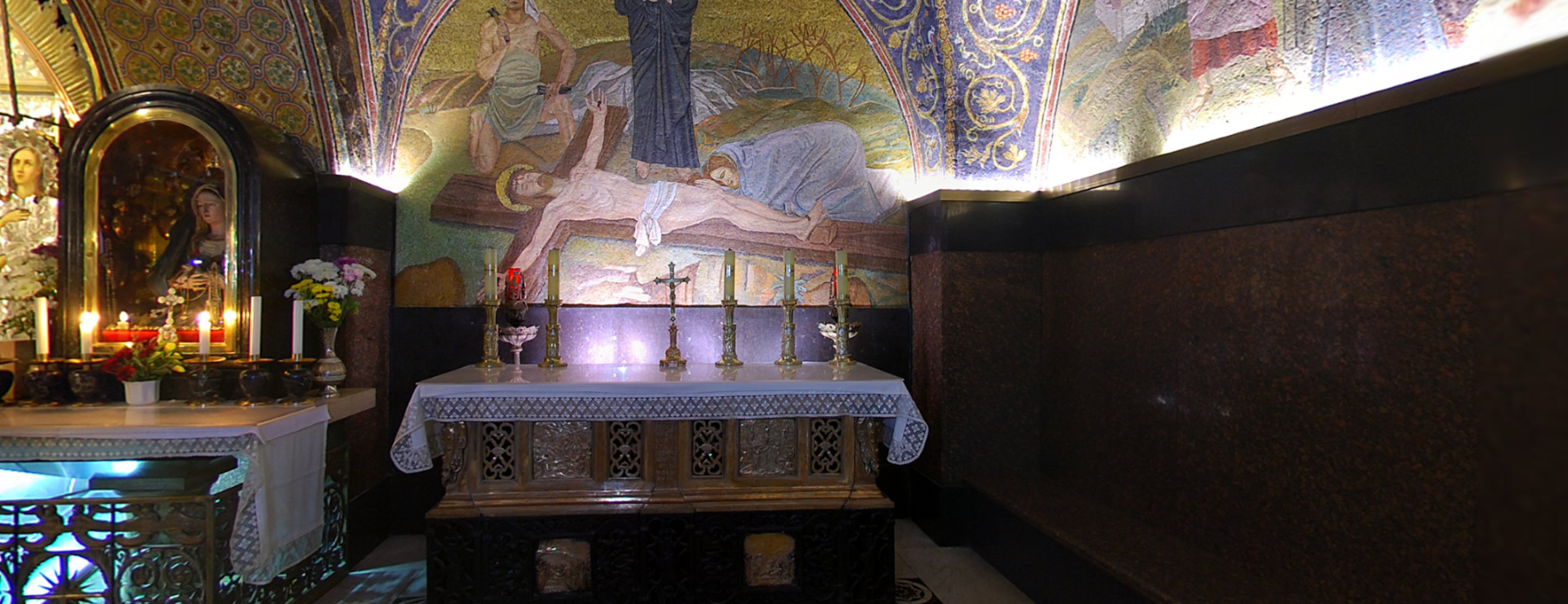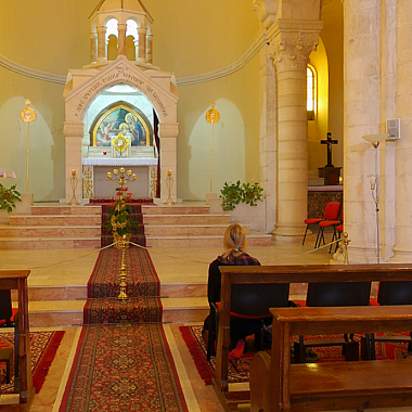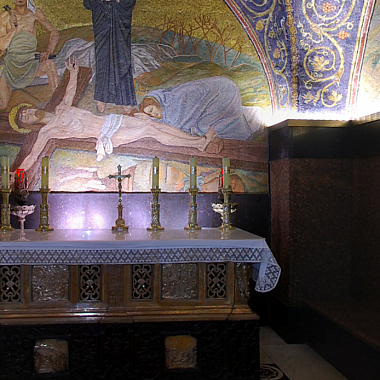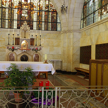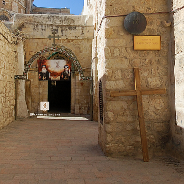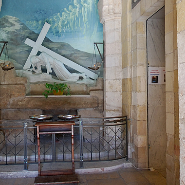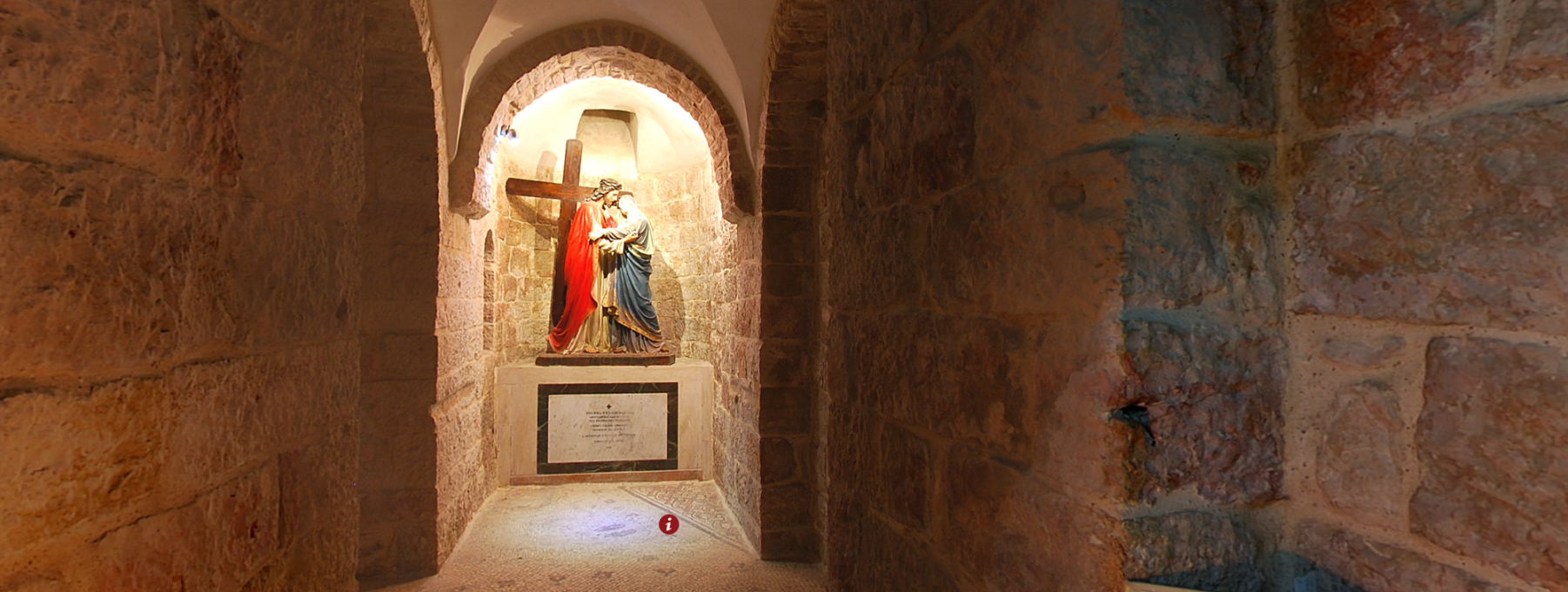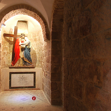 Армянская католическая церковь Мук Богородицы посвящена четвертой остановке Крестного пути - встрече Иисуса и его матери. Дева Мария, мать Спасителя была среди тех, кто сопровождал его в последнем земном пути. Хотя в Евангелиях об этом и не говорится, но считается, что в этом месте она прорвалась через оцепление римских солдат и вышла навстречу своему сыну.Мы находимся в крипте,то есть подземном помещении. Здесь расположена главная святыня Армянской Католической Церкви Мук Богородицы. Именно тут в период строительства были обнаружены византийские мозаики, в центре которых сохранились следы от подошв сандалий Богородицы.