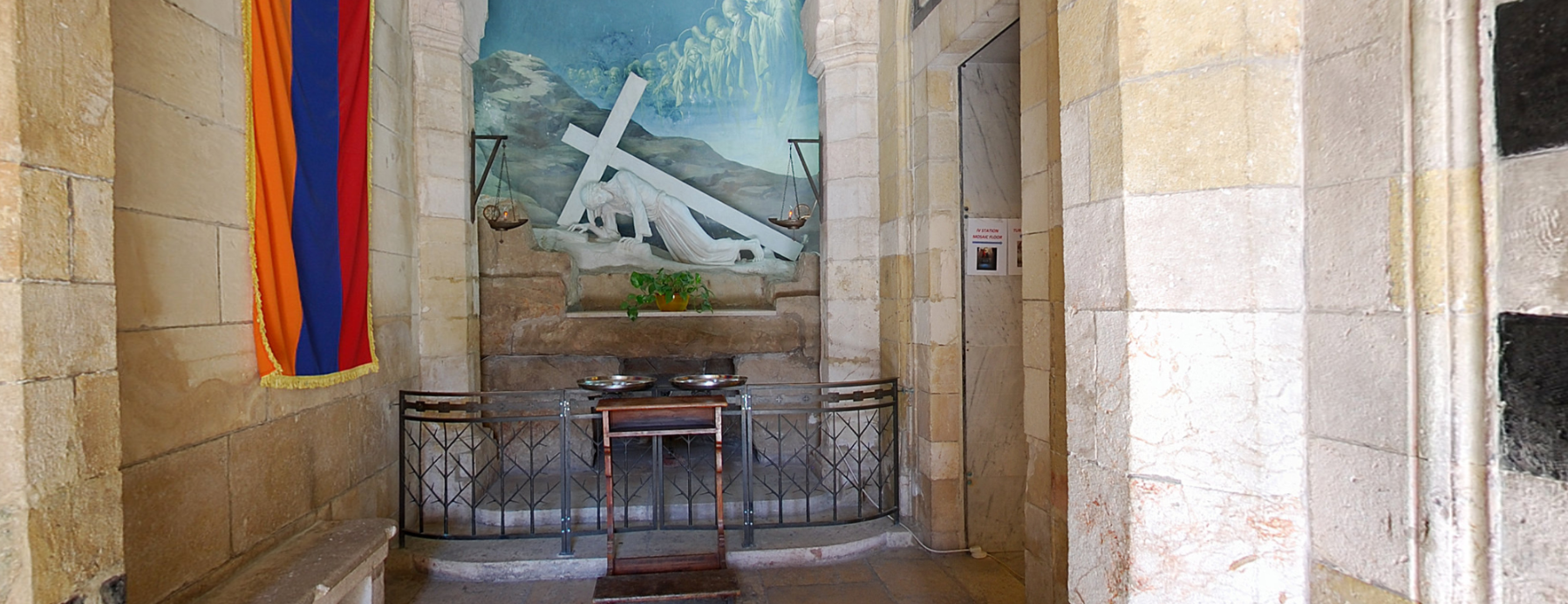 Перекресток улицы Виа Долороса и улицы Гай отмечен сразу 2 остановками крестного пути : третьей - где, Иисус падает в первый раз под тяжестью креста, и четвертой - тут Иисус встречает свою Мать, Деву Марию.Армянская капелла и Армянский католический собор Мук Богородицы посвящены этим событиям. Приглашаем вас посетить их в нашем виртуальном туре.