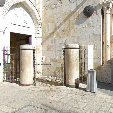 9 остановка и третье падение Христа.В этом месте Спаситель упал и ему открылся вид на Голгофу, место , где он будет распят и примет мученическую смерть . Это место обозначает колонна, стоящая у коптского монастыря.